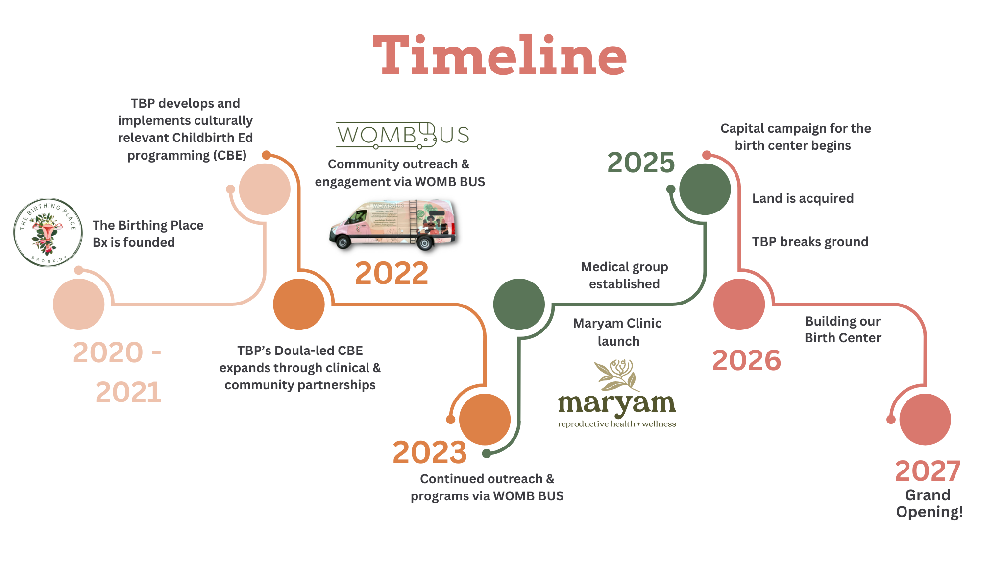 - In 2022: Womb Bus was launched! This mobile wellness hub and perinatal safe spot provides education, resources and support to families throughout many underserved Bronx neighborhoods.